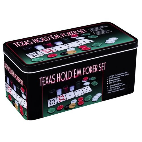 Blik Pokerfiches Texas Hold'em. Met 200 fiches 40 mm. tweekleurig van 4 gram in houder. Met kleed, 2 decks speelkaarten en dealer chip. HOT-Games