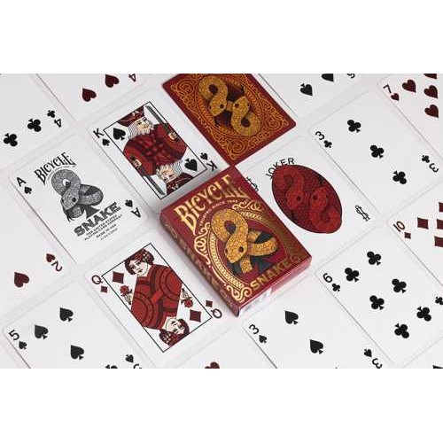 Toon sluwe wijsheid en intelligentie in het Jaar van de Slang met Bicycle Snake speelkaarten! Aangepaste hofkaarten gekleed in kimono-geïnspireerde kledingstukken geven een unieke flair aan uw volgende spel; en de schitterende, gouden folie slang op de tuck case staat klaar om toe te slaan!